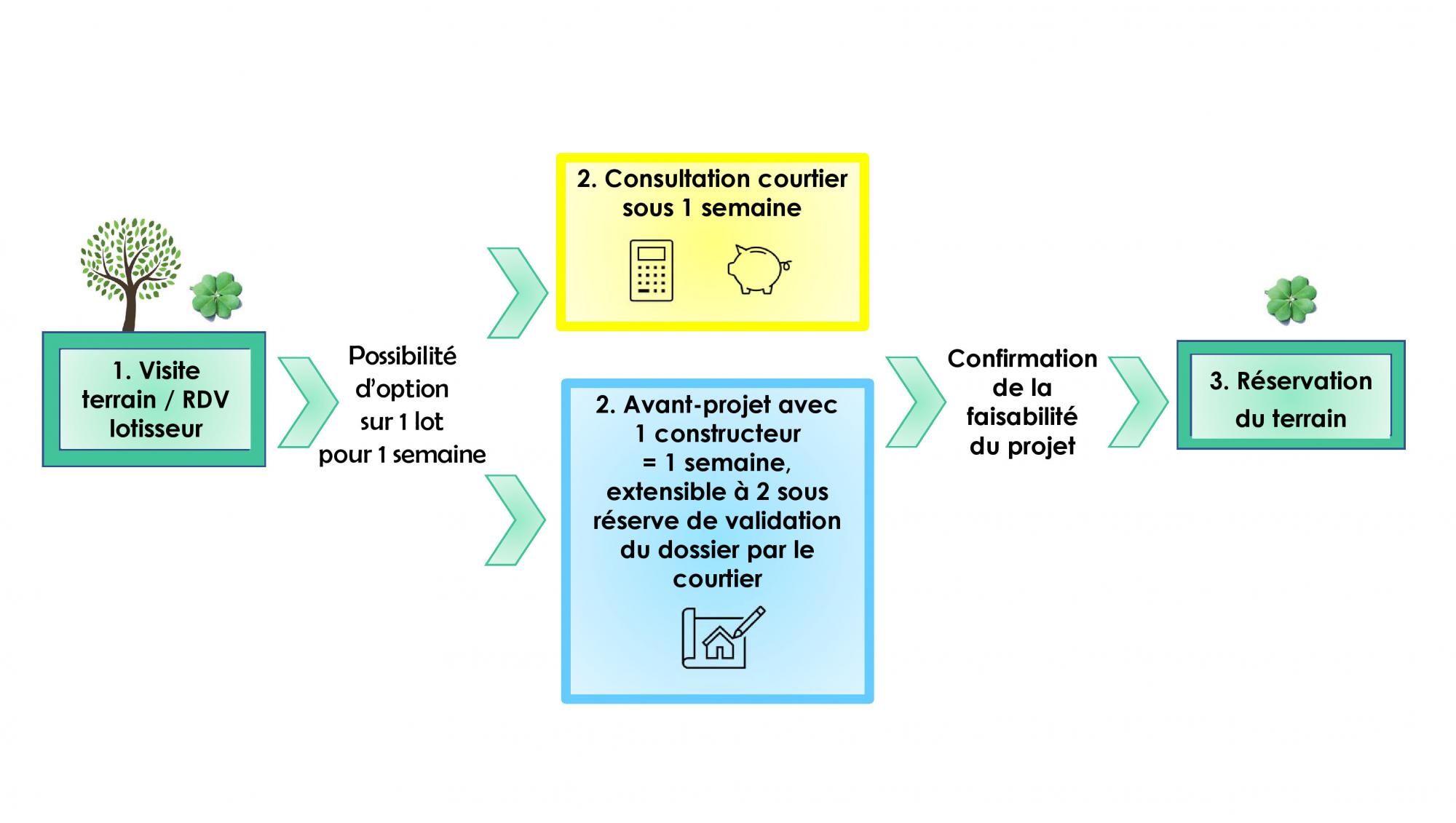 Une option peut être accordée après un premier rendez vous sur site au à notre agence, sur 1 lot et pour un délai de 2 semaines maximum. Ce délai a pour but de vous permettre de réaliser les études suivantes :