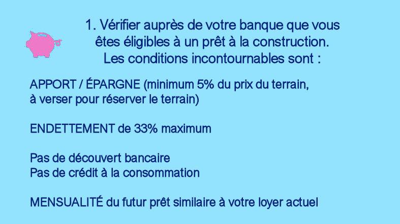 1. Faire un point avec sa banque actuelle pour vérifier que vous pouvez prétendre à un prêt pour la construction, et de quel montant vous pourriez disposer